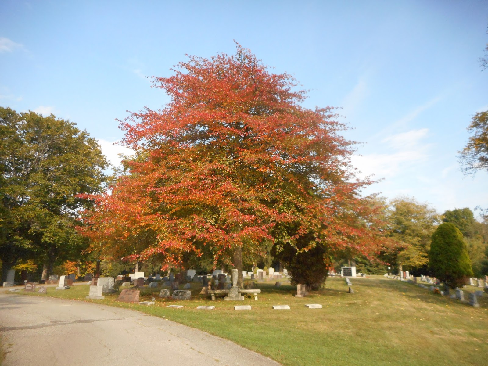 Bam! Dressed in it's finest. I need to travel out of town and really take in the scenery before the winds of November have the trees bare. I'm sure I'll bore everyone with cemetery shots of the changing seasons. The beauty of October...the stark of November...the white and gray of Winter. Maybe it's cliché to compare the seasons to life but I do feel I'm in the Autumn of my life. I feel a different vibrancy than I did when I was in my 20's....my Spring I guess. I know in a few short years I'll be heading into the Winter of my life. I want to enjoy not only this actual Autumn season, but also my life's Autumn. I feel more deeply about certain things and have slowly let go of unimportant ones....like leaves falling from the trees. It's the last show of color for this season and I feel I'm in my last show of color in areas like my career. In a few weeks one of my co-workers is retiring. That leaves me one of the oldest workers in our department. I can remember when I was the youngest! I wouldn't give up the knowledge I've gained during the Summer of my life...it makes the Autumn more meaningful...interesting....and beautiful....just like leaf peeping.